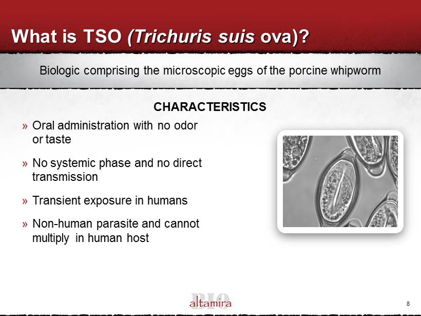 What is TSO ( Trichuris suis ova)? » Oral administration with no odor or taste » No systemic phase and no direct transmission » Transient exposure in humans » Non - human parasite and cannot multiply in human host 8 Biologic comprising the microscopic eggs of the porcine whipworm CHARACTERISTICS