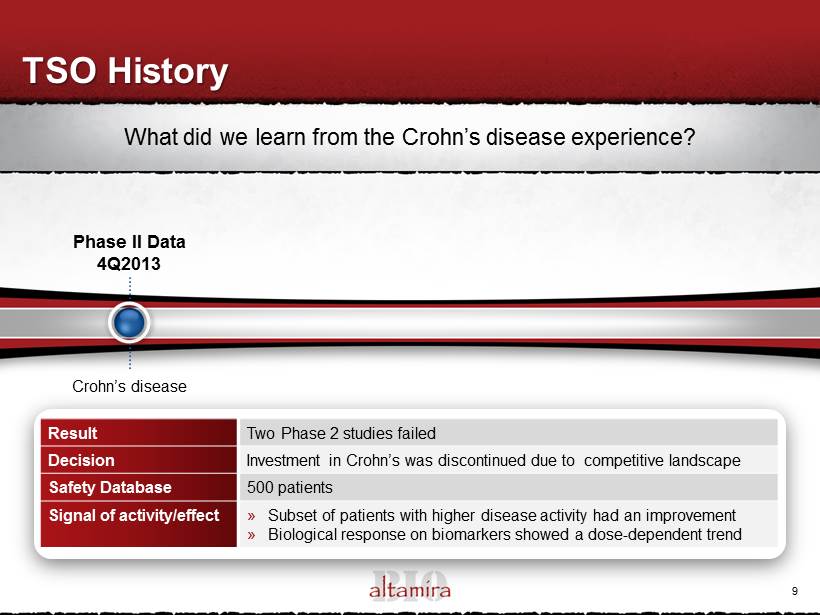 TSO History 9 What did we learn from the Crohn’s disease experience? Phase II Data 4Q2013 Crohn’s disease Result Two Phase 2 studies failed Decision Investment in Crohn’s was discontinued due to competitive landscape Safety Database 500 patients Signal of activity/effect » Subset of patients with higher disease activity had an improvement » Biological response on biomarkers showed a dose - dependent trend