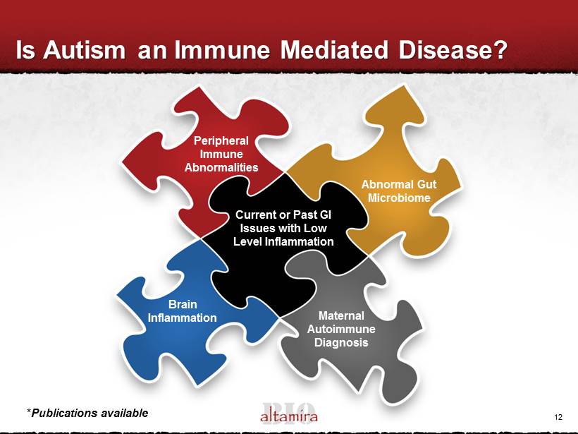 Is Autism an Immune Mediated Disease? 12 Current or Past GI Issues with Low Level Inflammation Maternal Autoimmune Diagnosis Brain Inflammation Peripheral Immune Abnormalities Abnormal Gut Microbiome * Publications available