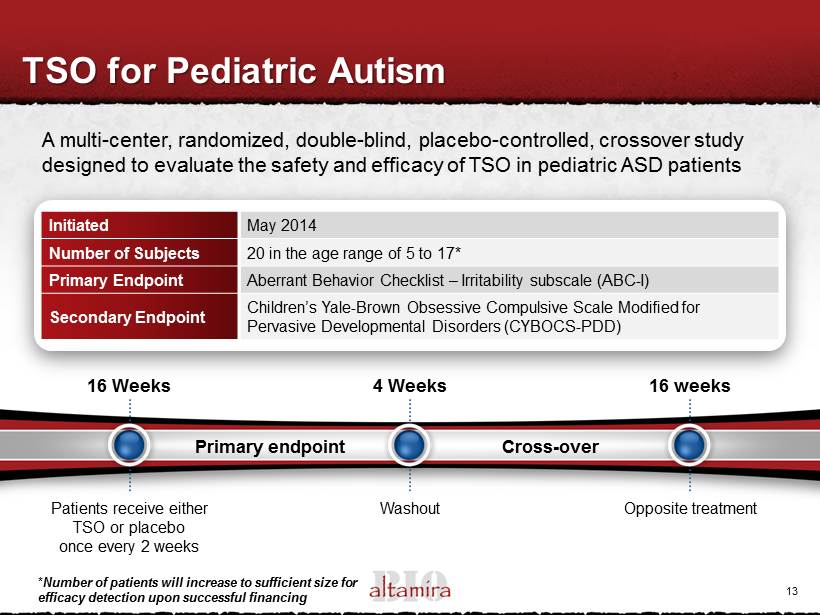 TSO for Pediatric Autism A multi - center, randomized, double - blind, placebo - controlled, crossover study designed to evaluate the safety and efficacy of TSO in pediatric ASD patients 13 16 Weeks Patients receive either TSO or placebo once every 2 weeks 4 Weeks Washout 16 weeks Opposite treatment Primary endpoint Cross - over Initiated May 2014 Number of Subjects 20 in the age range of 5 to 17* Primary Endpoint Aberrant Behavior Checklist – Irritability subscale (ABC - I) Secondary Endpoint Children’s Yale - Brown Obsessive Compulsive Scale Modified for Pervasive Developmental Disorders (CYBOCS - PDD) * Number of patients will increase to sufficient size for efficacy detection upon successful financing