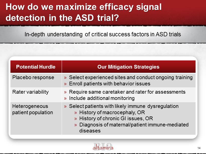 How do we maximize efficacy signal detection in the ASD trial? Potential Hurdle Our Mitigation Strategies Placebo response » Select experienced sites and conduct ongoing training » Enroll patients with behavior issues Rater variability » Require same caretaker and rater for assessments » Include additional monitoring Heterogeneous patient population » Select patients with likely immune dysregulation » History of macrocephaly, OR » History of chronic GI issues, OR » Diagnosis of maternal/patient immune - mediated diseases 14 In - depth understanding of critical success factors in ASD trials