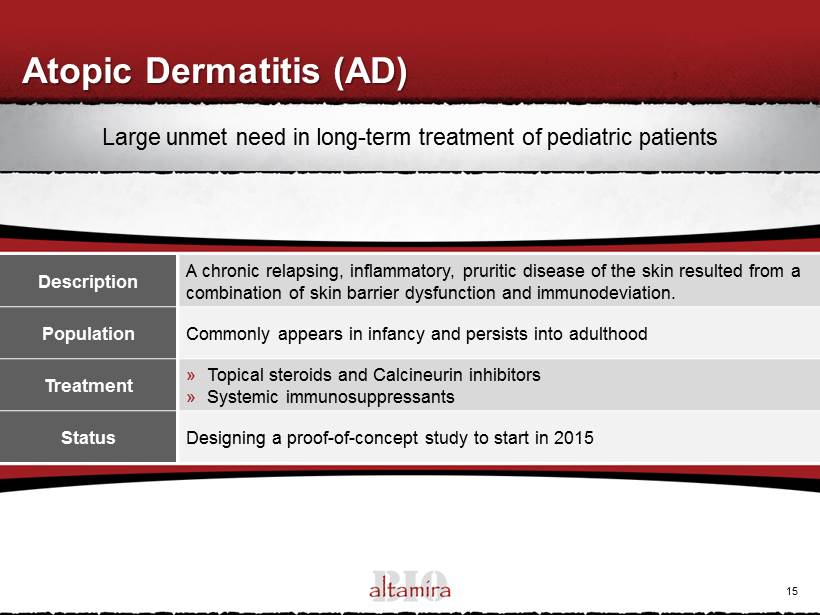 Atopic Dermatitis (AD) 15 Large unmet need in long - term treatment of pediatric patients Description A chronic relapsing, inflammatory, pruritic disease of the skin resulted from a combination of skin barrier dysfunction and immunodeviation . Population C ommonly appears in infancy and persists into adulthood Treatment » Topical steroids and Calcineurin inhibitors » Systemic immunosuppressants Status Designing a proof - of - concept study to start in 2015