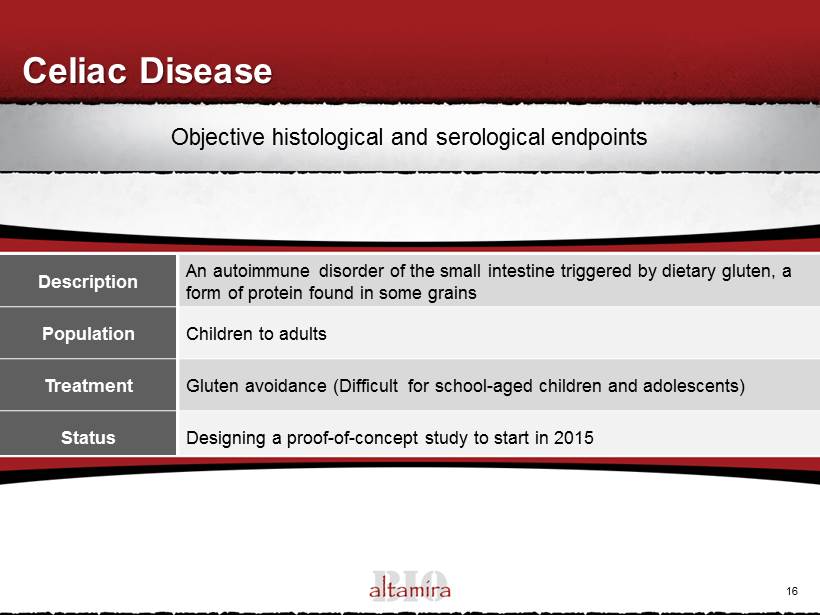 Celiac Disease 16 Objective histological and serological endpoints Description An autoimmune disorder of the small intestine triggered by dietary gluten, a form of protein found in some grains Population Children to adults Treatment Gluten avoidance (Difficult for school - aged children and adolescents) Status Designing a proof - of - concept study to start in 2015