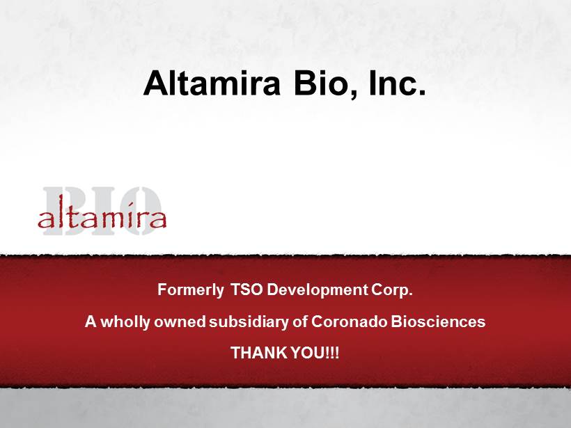 Altamira Bio, Inc. Formerly TSO Development Corp. A wholly owned subsidiary of Coronado Biosciences THANK YOU!!!