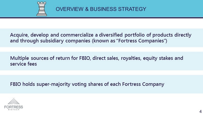FORTRESS BIOTECH COMPANIES Acute settings (pain) Multiple cancers/Epigene tics/Antibodies Orphan diseases Infectious diseases (CMV) Dermatology (marketed products) CAR - T/ Immuno - oncology (brain cancer, leukemia) 3