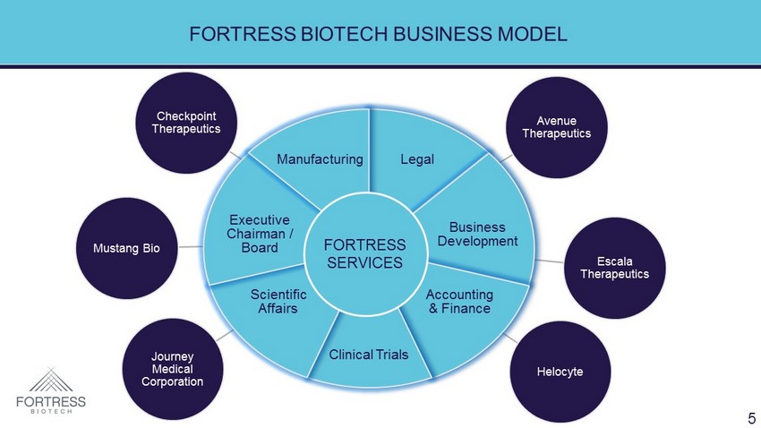 OVERVIEW & BUSINESS STRATEGY Acquire, develop and commercialize a diversified portfolio of products directly and through subsidiary companies (known as “Fortress Companies”) FBIO holds super - majority voting shares of each Fortress Company Multiple sources of return for FBIO, direct sales, royalties, equity stakes and service fees 4
