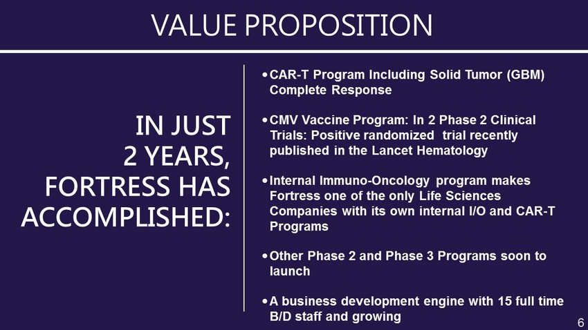 • CAR - T Program Including Solid Tumor (GBM) Complete Response • CMV Vaccine Program: In 2 Phase 2 Clinical Trials: Positive randomized trial recently published in the Lancet Hematology • Internal Immuno - Oncology program makes Fortress one of the only Life Sciences Companies with its own internal I/O and CAR - T Programs • Other Phase 2 and Phase 3 Programs soon to launch • A business development engine with 15 full time B/D staff and growing VALUE PROPOSITION IN JUST 2 YEARS, FORTRESS HAS ACCOMPLISHED: 6