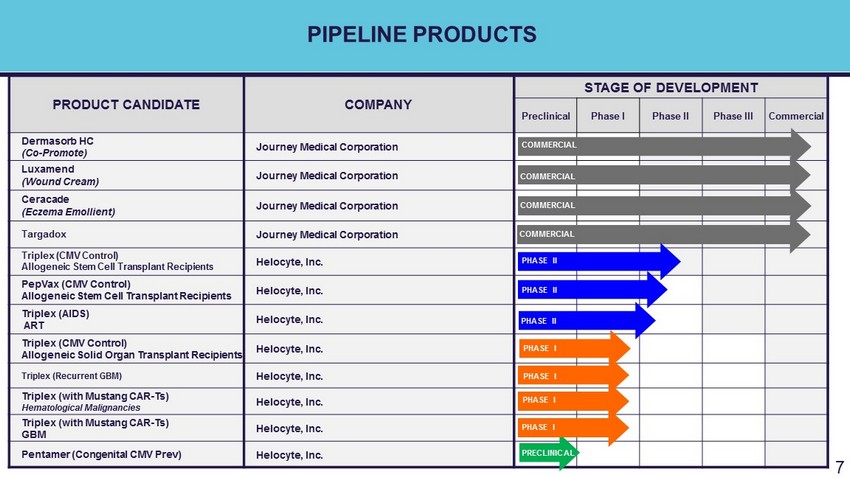 PIPELINE PRODUCTS PRODUCT CANDIDATE COMPANY STAGE OF DEVELOPMENT Preclinical Phase I Phase II Phase III Commercial Dermasorb HC (Co - Promote) Journey Medical Corporation Luxamend (Wound Cream) Journey Medical Corporation Ceracade (Eczema Emollient) Journey Medical Corporation Targadox Journey Medical Corporation Triplex (CMV Control) Allogeneic Stem Cell Transplant Recipients Helocyte, Inc. PepVax (CMV Control) Allogeneic Stem Cell Transplant Recipients Helocyte, Inc. PHASE II Triplex (AIDS) ART Helocyte, Inc. PHASE II Triplex (CMV Control) Allogeneic Solid Organ Transplant Recipients Helocyte, Inc. Triplex (Recurrent GBM) Helocyte, Inc. Triplex (with Mustang CAR - Ts) Hematological Malignancies Helocyte, Inc. Triplex (with Mustang CAR - Ts) GBM Helocyte, Inc. Pentamer (Congenital CMV Prev ) Helocyte, Inc. 7 COMMERCIAL COMMERCIAL COMMERCIAL COMMERCIAL PHASE II PHASE II PHASE II PRECLINICAL PHASE I PHASE I PHASE I PHASE I