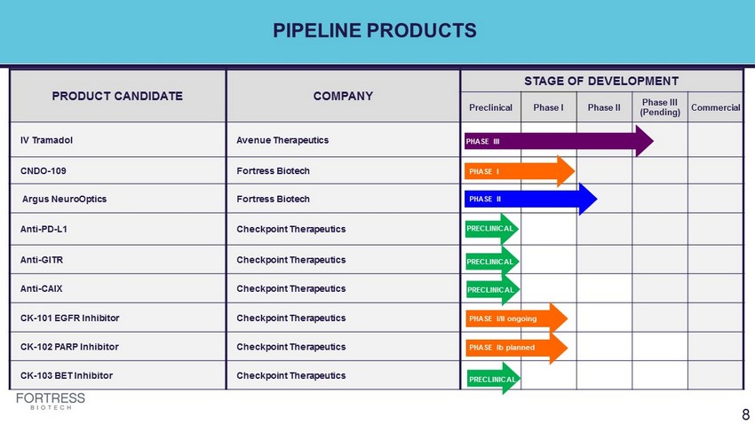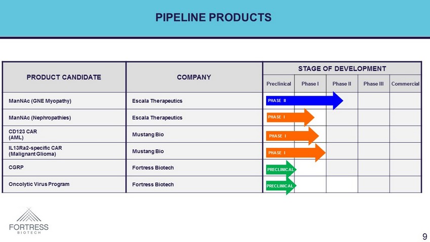 PIPELINE PRODUCTS PRODUCT CANDIDATE COMPANY STAGE OF DEVELOPMENT Preclinical Phase I Phase II Phase III (Pending) Commercial IV Tramadol Avenue Therapeutics CNDO - 109 Fortress Biotech Argus NeuroOptics Fortress Biotech Anti - PD - L1 Checkpoint Therapeutics Anti - GITR Checkpoint Therapeutics Anti - CAIX Checkpoint Therapeutics PHASE II CK - 101 EGFR Inhibitor Checkpoint Therapeutics PHASE II CK - 102 PARP Inhibitor Checkpoint Therapeutics CK - 103 BET Inhibitor Checkpoint Therapeutics 8 PHASE III PHASE I PHASE II PHASE I PHASE I PHASE I/II ongoing PHASE I PHASE Ib planned PHASE I PRECLINICAL PRECLINICAL PRECLINICAL PRECLINICAL PRECLINICAL