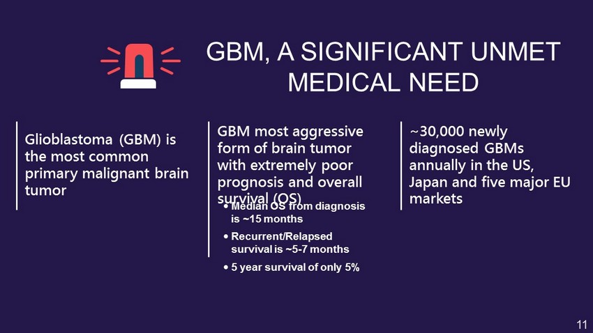 GBM, A SIGNIFICANT UNMET MEDICAL NEED ~30,000 newly diagnosed GBMs annually in the US, Japan and five major EU markets GBM most aggressive form of brain tumor with extremely poor prognosis and overall survival (OS) Glioblastoma (GBM) is the most common primary malignant brain tumor • Median OS from diagnosis is ~15 months • Recurrent/Relapsed survival is ~5 - 7 months • 5 year survival of only 5% 11