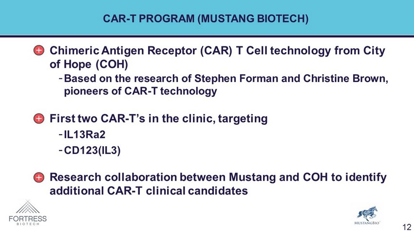 CAR - T PROGRAM (MUSTANG BIOTECH) Chimeric Antigen Receptor (CAR) T Cell technology from City of Hope (COH) - Based on the research of Stephen Forman and Christine Brown, pioneers of CAR - T technology Research collaboration between Mustang and COH to identify additional CAR - T clinical candidates First two CAR - T’s in the clinic, targeting - IL13Ra2 - CD123(IL3) 12