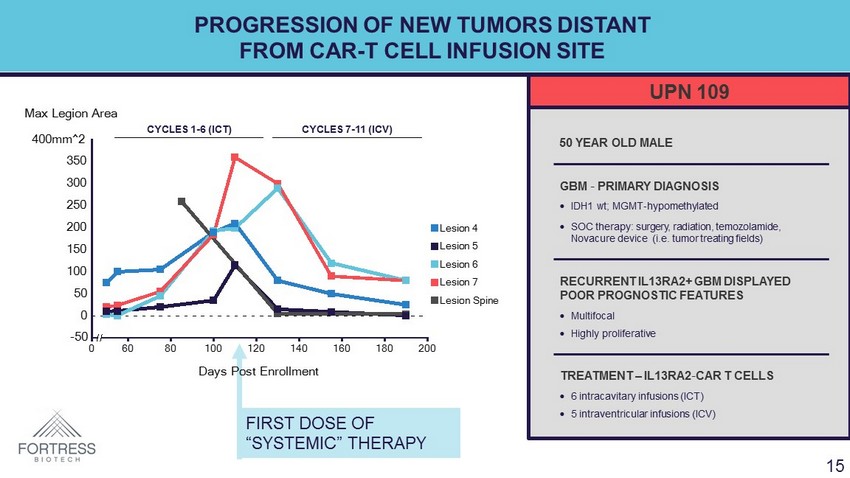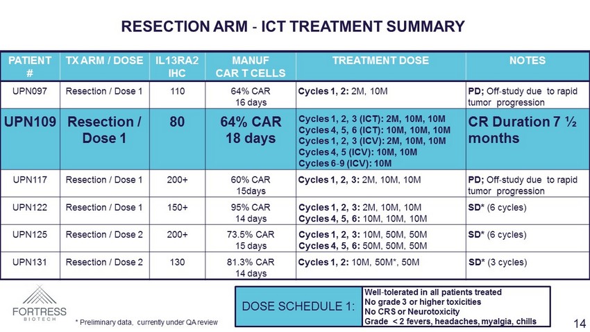 PATIENT # TX ARM / DOSE IL13RA2 IHC MANUF CAR T CELLS TREATMENT DOSE NOTES UPN097 Resection / Dose 1 110 64% CAR 16 days Cycles 1, 2: 2M, 10M PD; Off - study due to rapid tumor progression UPN109 Resection / Dose 1 80 64% CAR 18 days Cycles 1, 2, 3 (ICT): 2M, 10M, 10M Cycles 4, 5, 6 (ICT): 10M, 10M, 10M Cycles 1, 2, 3 (ICV): 2M, 10M, 10M Cycles 4, 5 (ICV): 10M, 10M Cycles 6 - 9 (ICV): 10M CR Duration 7 ½ months UPN117 Resection / Dose 1 200+ 60% CAR 15days Cycles 1, 2, 3: 2M, 10M, 10M PD; Off - study due to rapid tumor progression UPN122 Resection / Dose 1 150+ 95% CAR 14 days Cycles 1, 2, 3: 2M, 10M, 10M Cycles 4, 5, 6: 10M, 10M, 10M SD* (6 cycles) UPN125 Resection / Dose 2 200+ 73.5% CAR 15 days Cycles 1, 2, 3: 10M, 50M, 50M Cycles 4, 5, 6: 50M, 50M, 50M SD* (6 cycles) UPN131 Resection / Dose 2 130 81.3% CAR 14 days Cycles 1, 2: 10M, 50M*, 50M SD* (3 cycles) RESECTION ARM - ICT TREATMENT SUMMARY DOSE SCHEDULE 1: Well - tolerated in all patients treated No grade 3 or higher toxicities No CRS or Neurotoxicity Grade < 2 fevers, headaches, myalgia, chills * Preliminary data, currently under QA review 14