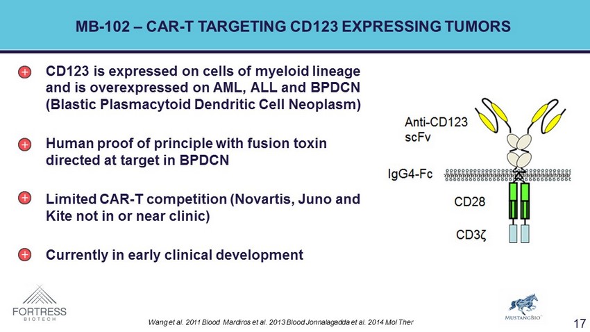 MB - 102 – CAR - T TARGETING CD123 EXPRESSING TUMORS CD123 is expressed on cells of myeloid lineage and is overexpressed on AML, ALL and BPDCN ( Blastic Plasmacytoid Dendritic Cell Neoplasm) Human proof of principle with fusion toxin directed at target in BPDCN Limited CAR - T competition (Novartis, Juno and Kite not in or near clinic) Currently in early clinical development Wang et al. 2011 Blood Mardiros et al. 2013 Blood Jonnalagadda et al. 2014 Mol Ther 17