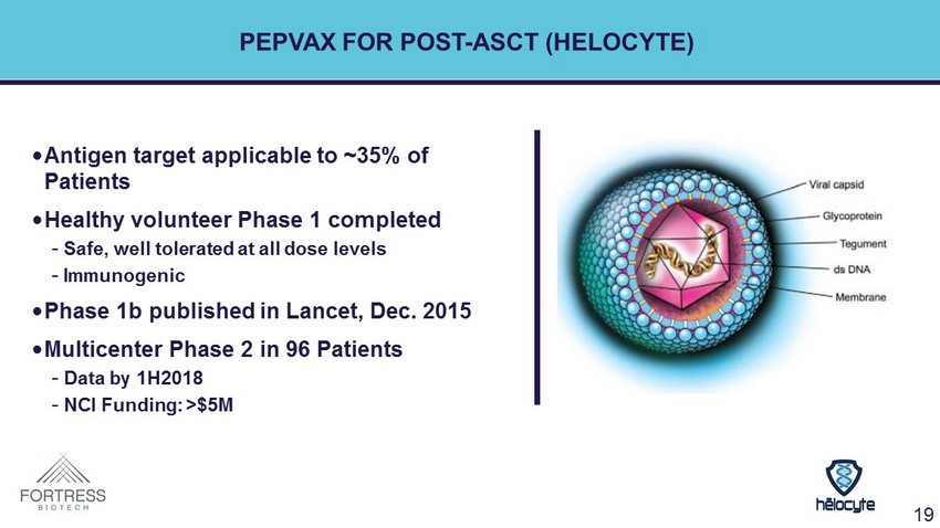 19 PEPVAX FOR POST - ASCT ( HELOCYTE ) • Antigen target applicable to ~35% of Patients • Healthy volunteer Phase 1 completed - Safe, well tolerated at all dose levels - Immunogenic • Phase 1b published in Lancet, Dec. 2015 • Multicenter Phase 2 in 96 Patients - Data by 1H2018 - NCI Funding: >$5M 19