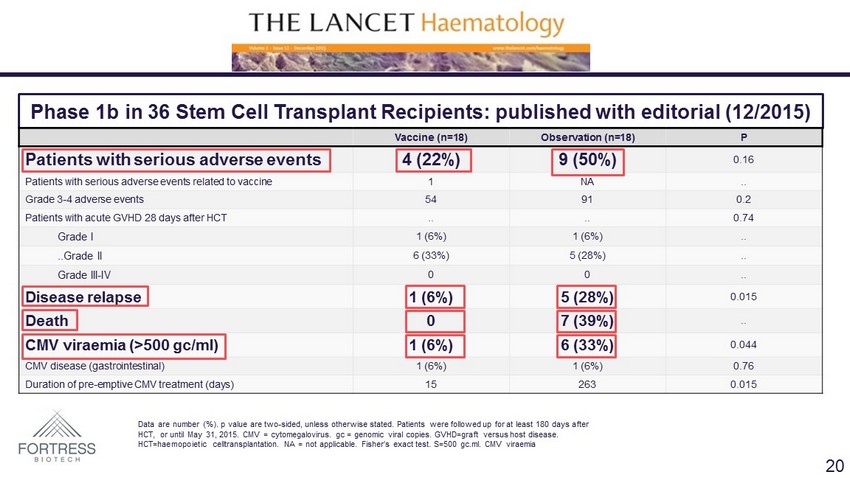 Phase 1b in 36 Stem Cell Transplant Recipients: published with editorial (12/2015) Vaccine (n=18) Observation (n=18) P Patients with serious adverse events 4 (22%) 9 (50%) 0.16 Patients with serious adverse events related to vaccine 1 NA .. Grade 3 - 4 adverse events 54 91 0.2 Patients with acute GVHD 28 days after HCT .. .. 0.74 Grade I 1 (6%) 1 (6%) .. ..Grade II 6 (33%) 5 (28%) .. Grade III - IV 0 0 .. Disease relapse 1 (6%) 5 (28%) 0.015 Death 0 7 (39%) .. CMV viraemia (>500 gc /ml) 1 (6%) 6 (33%) 0.044 CMV disease (gastrointestinal) 1 (6%) 1 (6%) 0.76 Duration of pre - emptive CMV treatment (days) 15 263 0.015 Data are number (%). p value are two - sided, unless otherwise stated. Patients were followed up for at least 180 days after HCT, or until May 31, 2015. CMV = cytomegalovirus. gc = genomic viral copies. GVHD=graft versus host disease. HCT= haemopoietic celltransplantation . NA = not applicable. Fisher’s exact test. S=500 gc.ml. CMV viraemia 20