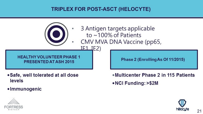 TRIPLEX FOR POST - ASCT ( HELOCYTE ) • 3 Antigen targets applicable to ~100% of Patients • CMV MVA DNA Vaccine (pp65, IE1, IE2) HEALTHY VOLUNTEER PHASE 1 PRESENTED AT ASH 2015 Phase 2 (Enrolling As Of 11/2015) • Safe, well tolerated at all dose levels • Immunogenic • Multicenter Phase 2 in 115 Patients • NCI Funding: >$2M 21