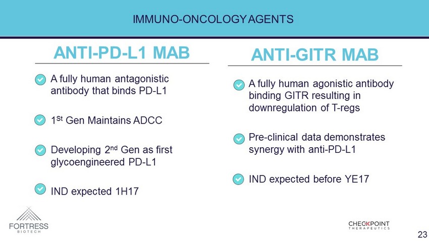 IMMUNO - ONCOLOGY AGENTS • A fully human agonistic antibody binding GITR resulting in downregulation of T - regs • Pre - clinical data demonstrates synergy with anti - PD - L1 • IND expected before YE17 • A fully human antagonistic antibody that binds PD - L1 • 1 St Gen Maintains ADCC • Developing 2 nd Gen as first glycoengineered PD - L1 • IND expected 1H17 ANTI - GITR MAB ANTI - PD - L1 MAB 23