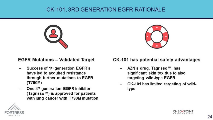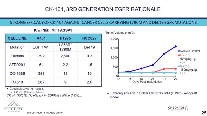 CK - 101, 3RD GENERATION EGFR RATIONALE ‒ Success of 1 st generation EGFR’s have led to acquired resistance through further mutations to EGFR (T790M) ‒ One 3 rd generation EGFR inhibitor ( Tagrisso ™) is approved for patients with lung cancer with T790M mutation ‒ AZN’s drug, Tagrisso ™, has significant skin tox due to also targeting wild - type EGFR ‒ CK - 101 has limited targeting of wild - type EGFR Mutations – Validated Target CK - 101 has potential safety advantages 24