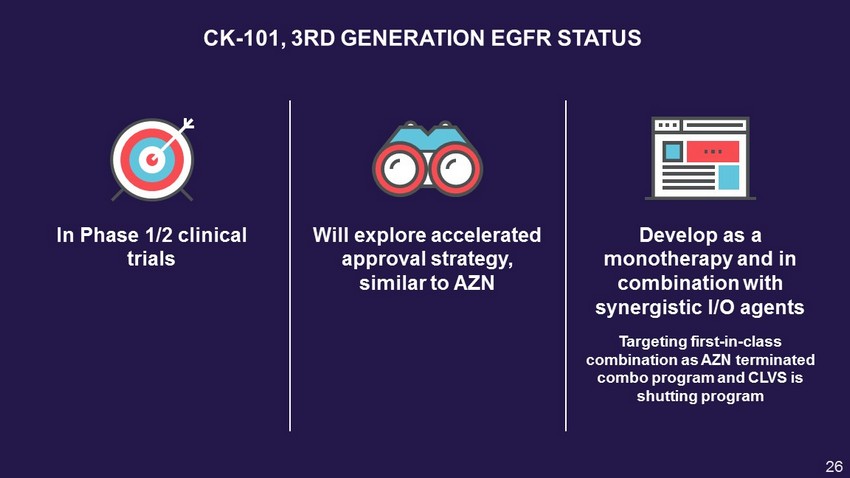 CK - 101, 3RD GENERATION EGFR RATIONALE 0 500 1,000 1,500 2,000 Tumor Volume (mm^3) 12 15 18 21 24 27 Days Post Implantation RX518, 150mg/kg, ig, QD RX518, 60mg/kg, ig, QD Vehicle Control CELL LINE A431 H1975 HCC827 Mutation EGFR WT L858R/ T790M Del 19 Erlotinib 392 2,500 9.3 AZD9291 64 2.2 1.5 CO - 1686 383 18 15 RX518 267 9 2.6 IC 50 ( NM ), MTT ASSAY • Good selectivity for mutant: - A431/H1975 ratio ~ 30 fold CK - 101(RX518): No efficacy for EGFR wt cell line (A431)… STRONG EFFICACY OF CK - 101 AGAINST CANCER CELLS CARRYING T790M AND DEL19 EGFR MUTATIONS • …Strong efficacy in EGFR L858R/T790M (H1975) xenograft model Source: NeuPharma , data on file 25