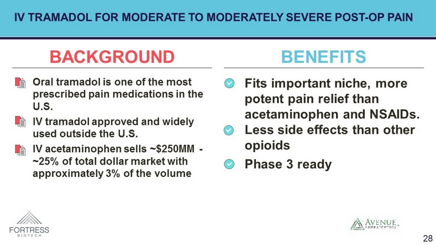 • Fits important niche, more potent pain relief than acetaminophen and NSAIDs. Less side effects than other opioids • Phase 3 ready • Oral tramadol is one of the most prescribed pain medications in the U.S. • IV tramadol approved and widely used outside the U.S. • IV acetaminophen sells ~$250MM - ~25% of total dollar market with approximately 3% of the volume BACKGROUND BENEFITS IV TRAMADOL FOR MODERATE TO MODERATELY SEVERE POST - OP PAIN 28