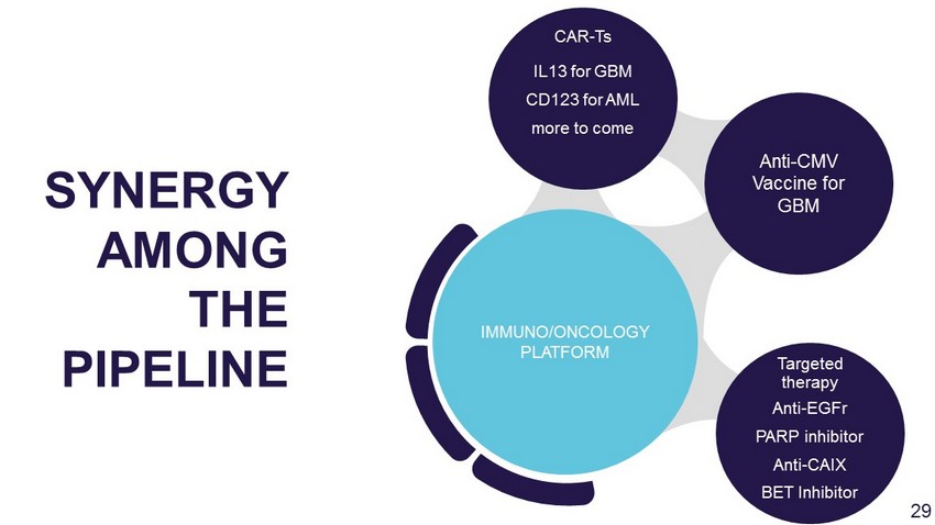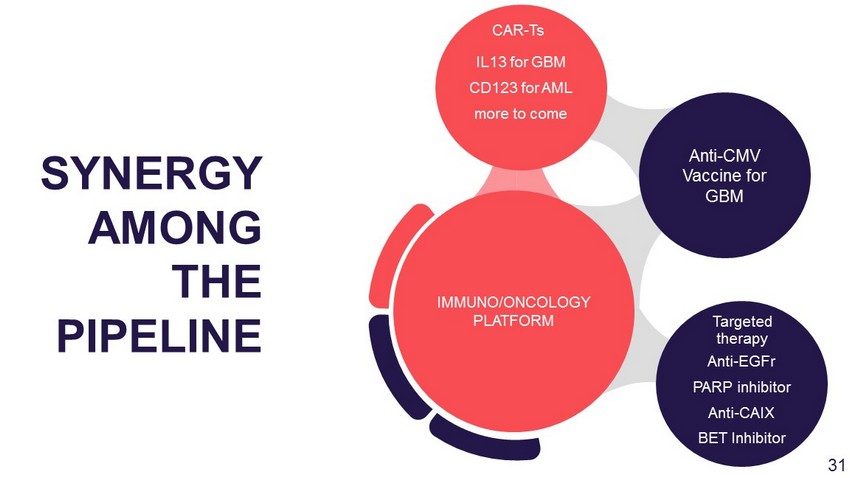 Anti - EGFr PARP inhibitor Anti - CAIX BET Inhibitor Anti - CMV Vaccine for GBM IL13 for GBM CD123 for AML more to come IMMUNO/ONCOLOGY PLATFORM SYNERGY AMONG THE PIPELINE CAR - Ts Targeted therapy 30