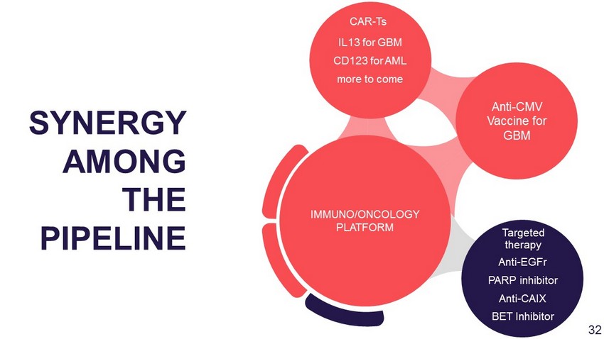 Anti - EGFr PARP inhibitor Anti - CAIX BET Inhibitor Anti - CMV Vaccine for GBM IL13 for GBM CD123 for AML more to come IMMUNO/ONCOLOGY PLATFORM SYNERGY AMONG THE PIPELINE CAR - Ts Targeted therapy 31