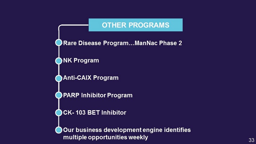 OTHER PROGRAMS • Rare Disease Program… ManNac Phase 2 • NK Program • Anti - CAIX Program • PARP Inhibitor Program • CK - 103 BET Inhibitor • Our business development engine identifies multiple opportunities weekly 33