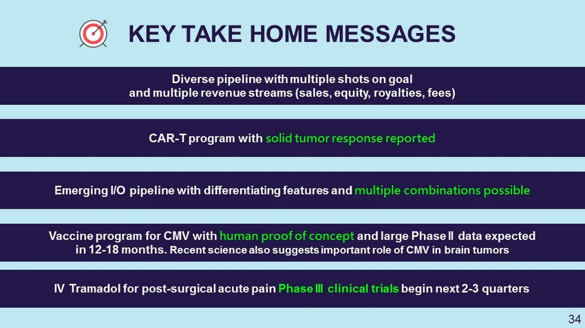 KEY TAKE HOME MESSAGES Diverse pipeline with multiple shots on goal and multiple revenue streams (sales, equity, royalties, fees) CAR - T program with solid tumor response reported Emerging I/O pipeline with differentiating features and multiple combinations possible Vaccine program for CMV with human proof of concept and large Phase II data expected in 12 - 18 months. Recent science also suggests important role of CMV in brain tumors IV Tramadol for post - surgical acute pain Phase III clinical trials begin next 2 - 3 quarters 34