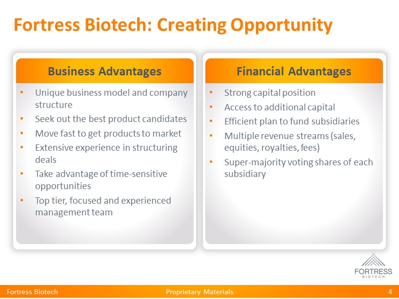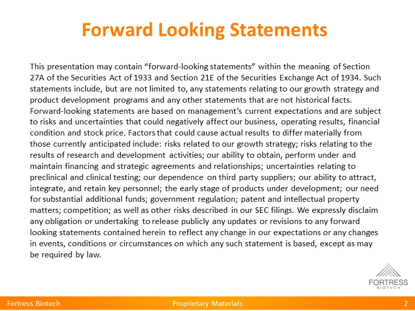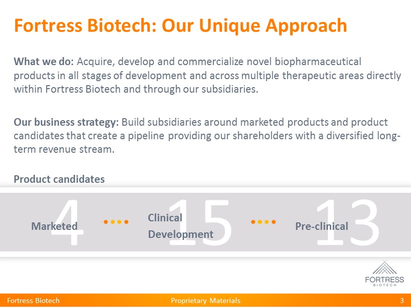 Proprietary Materials Fortress Biotech 2 This presentation may contain “forward - looking statements” within the meaning of Section 27A of the Securities Act of 1933 and Section 21E of the Securities Exchange Act of 1934. Such statements include, but are not limited to, any statements relating to our growth strategy and product development programs and any other statements that are not historical facts. Forward - looking statements are based on management’s current expectations and are subject to risks and uncertainties that could negatively affect our business, operating results, financial condition and stock price. Factors that could cause actual results to differ materially from those currently anticipated include: risks related to our growth strategy; risks relating to the results of research and development activities; our ability to obtain, perform under and maintain financing and strategic agreements and relationships; uncertainties relating to preclinical and clinical testing; our dependence on third party suppliers; our ability to attract, integrate, and retain key personnel; the early stage of products under development; our need for substantial additional funds; government regulation; patent and intellectual property matters; competition; as well as other risks described in our SEC filings. We expressly disclaim any obligation or undertaking to release publicly any updates or revisions to any forward looking statements contained herein to reflect any change in our expectations or any changes in events, conditions or circumstances on which any such statement is based, except as may be required by law. Forward Looking Statements