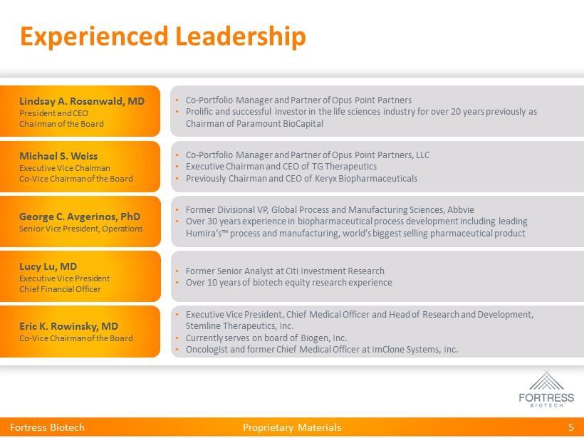 Proprietary Materials Fortress Biotech: Creating Opportunity Business Advantages • Unique business model and company structure • Seek out the best product candidates • Move fast to get products to market • Extensive experience in structuring deals • Take advantage of time - sensitive opportunities • Top tier, focused and experienced management team Financial Advantages • Strong capital position • Access to additional capital • Efficient plan to fund subsidiaries • Multiple revenue streams (sales, equities, royalties, fees) • Super - majority voting shares of each subsidiary 4 Fortress Biotech