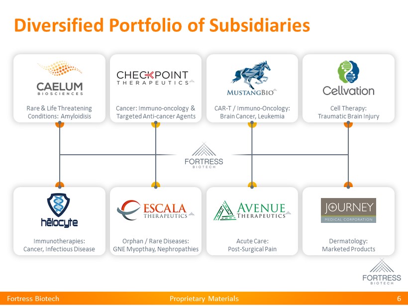 Proprietary Materials Experienced Leadership 5 • Co - Portfolio Manager and Partner of Opus Point Partners • Prolific and successful investor in the life sciences industry for over 20 years previously as Chairman of Paramount BioCapital Lindsay A. Rosenwald, MD President and CEO Chairman of the Board • Co - Portfolio Manager and Partner of Opus Point Partners, LLC • Executive Chairman and CEO of TG Therapeutics • Previously Chairman and CEO of Keryx Biopharmaceuticals Michael S. Weiss Executive Vice Chairman Co - Vice Chairman of the Board • Executive Vice President, Chief Medical Officer and Head of Research and Development, Stemline Therapeutics, Inc. • Currently serves on board of Biogen , Inc. • Oncologist and former Chief Medical Officer at ImClone Systems, Inc. Eric K. Rowinsky, MD Co - Vice Chairman of the Board • Former Senior Analyst at Citi Investment Research • Over 10 years of biotech equity research experience Lucy Lu, MD Executive Vice President Chief Financial Officer • Former Divisional VP, Global Process and Manufacturing Sciences, Abbvie • Over 30 years experience in biopharmaceutical process development including leading Humira’s™ process and manufacturing, world’s biggest selling pharmaceutical product George C. Avgerinos, PhD Senior Vice President, Operations Fortress Biotech