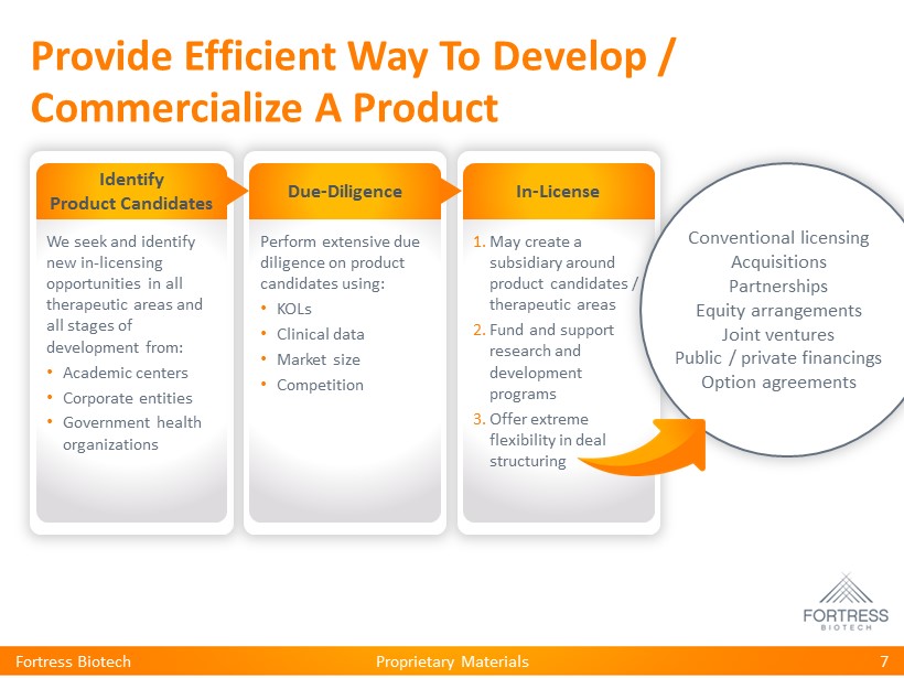Proprietary Materials Provide Efficient Way To Develop / Commercialize A Product Fortress Biotech 7 Identify Product Candidates We seek and identify new in - licensing opportunities in all therapeutic areas and all stages of development from: • Academic centers • Corporate entities • Government health organizations Due - Diligence Perform extensive due diligence on product candidates using: • KOLs • Clinical data • Market size • Competition In - License 1. May create a subsidiary around product candidates / therapeutic areas 2. Fund and support research and development programs 3. Offer extreme flexibility in deal structuring Conventional licensing Acquisitions Partnerships Equity arrangements Joint ventures Public / private financings Option agreements