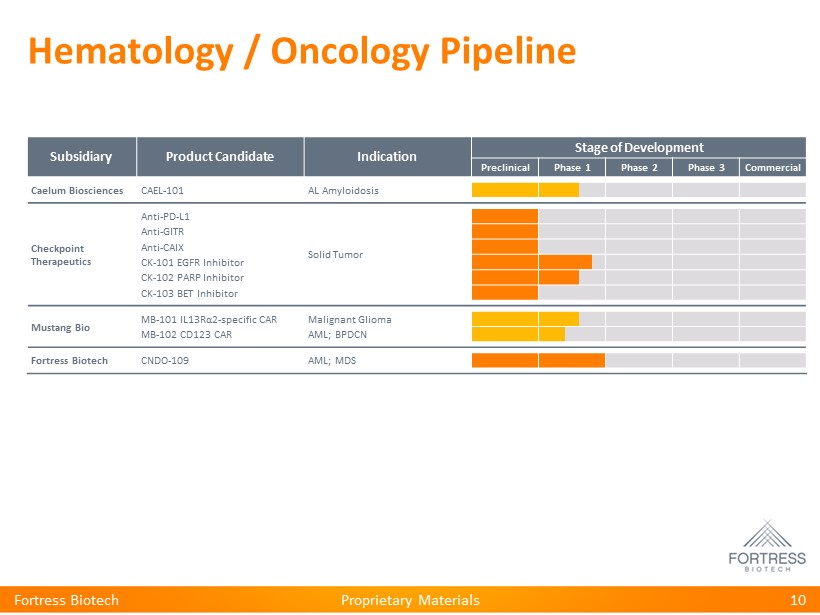 Proprietary Materials Hematology / Oncology Pipeline Subsidiary Product Candidate Indication Stage of Development Preclinical Phase 1 Phase 2 Phase 3 Commercial Caelum Biosciences CAEL - 101 AL Amyloidosis Checkpoint Therapeutics Anti - PD - L1 Solid Tumor Anti - GITR Anti - CAIX CK - 101 EGFR Inhibitor CK - 102 PARP Inhibitor CK - 103 BET Inhibitor Mustang Bio MB - 101 IL13R α 2 - specific CAR Malignant Glioma MB - 102 CD123 CAR AML; BPDCN Fortress Biotech CNDO - 109 AML; MDS 10 Fortress Biotech