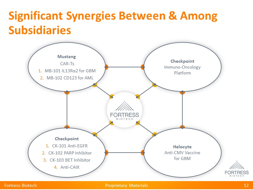 Proprietary Materials Proprietary Materials Diversified Pipeline Across Different Therapeutic Areas Fortress Biotech 11 Subsidiary Product Candidate Indication Stage of Development Preclinical Phase 1 Phase 2 Phase 3 Commercial Cellvation CEVA101 MNCs for Pediatric TBI CEVA101 MNCs for Adult TBI CEVA102 NextGen for Pediatric TBI CEVA102 NextGen for Adult TBI CEVA - D Bioreactor – Device Helocyte Triplex CMV Control Allo - Stem Cell PepVax CMV Control Allo - Stem Cell Triplex CMV Control Solid Organ Tumor Triplex Glioblastoma Multiforme Triplex Hematological Malignancies Triplex plus Mustang CAR - T Glioblastoma Multiforme Triplex plus Mustang CAR - T Hematalogical Malignancies Pentamer Congenital CMV Escala Therapeutics ManNAc GNE Myopathy ManNAc Nephropathies Avenue Therapeutics IV Tramadol Post Surgical Pain Journey Medical Corporation Targadox Acne Ceracade Eczema Emollient Luxamend Wound Cream Dermasorb HC Atopic Dermatitis