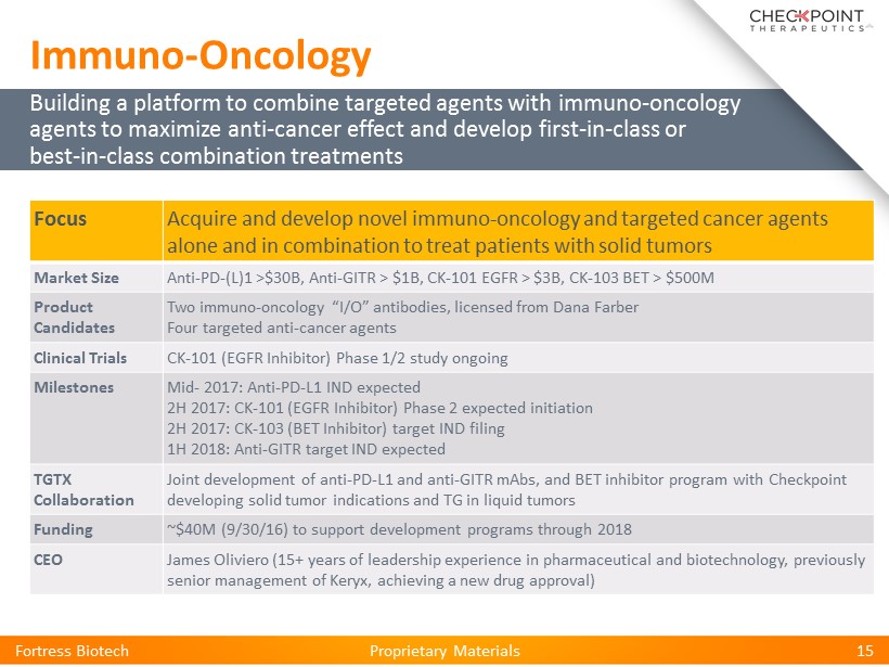 Proprietary Materials Proprietary Materials Fortress Biotech 15 Focus Acquire and develop novel immuno - oncology and targeted cancer agents alone and in combination to treat patients with solid tumors Market Size Anti - PD - (L)1 >$30B, Anti - GITR > $1B, CK - 101 EGFR > $3B, CK - 103 BET > $500M Product Candidates Two immuno - oncology “I/O” antibodies, licensed from Dana Farber Four targeted anti - cancer agents Clinical Trials CK - 101 (EGFR Inhibitor) Phase 1/2 study ongoing Milestones Mid - 2017: Anti - PD - L1 IND expected 2H 2017: CK - 101 (EGFR Inhibitor) Phase 2 expected initiation 2H 2017: CK - 103 (BET Inhibitor) target IND filing 1H 2018: Anti - GITR target IND expected TGTX Collaboration Joint development of anti - PD - L1 and anti - GITR mAbs , and BET inhibitor program with Checkpoint developing solid tumor indications and TG in liquid tumors Funding ~$40M (9/30/16) to support development programs through 2018 CEO James Oliviero (15+ years of leadership experience in pharmaceutical and biotechnology, previously senior management of Keryx , achieving a new drug approval) Building a platform to combine targeted agents with immuno - oncology agents to maximize anti - cancer effect and develop first - in - class or best - in - class combination treatments Immuno - Oncology