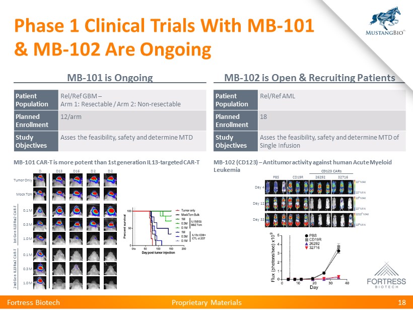 Proprietary Materials Proprietary Materials Fortress Biotech 17 Focus Two lead CAR - T programs targeting IL13R α 2 and CD123, for the treatment of Glioblastoma Multiforme and AML/BPDCN, respectively Market Size In U.S., Japan and five major EU markets per year… ~30,000 newly diagnosed GBMs (malignant brain tumor) ~30,000 newly diagnosed cases of AML (acute myeloid leukemia) Product Candidates MB - 101 IL13R α 2 - specific CAR - T cells which have no current competition MB - 102 CD123 - specific CAR - T cells which have been validated in ultra orphan indication Clinical Trials Two Phase 1 trials ongoing with preliminary safety data from at least 6 patients in both CAR - T programs Milestones Phase 1 data readouts early 2018 NEJM case study demonstrates MB - 101 achieved complete remission in patient with recurrent GBM Licensor City of Hope Scientific Advisors Dr. Stephen Forman, City of Hope Dr. Christine Brown, City of Hope Robust CAR - T platform technology in partnership with pioneers in CAR - T technologies from City of Hope, recently raising a $94.5M private placement financing Aggressive Forms of Cancer