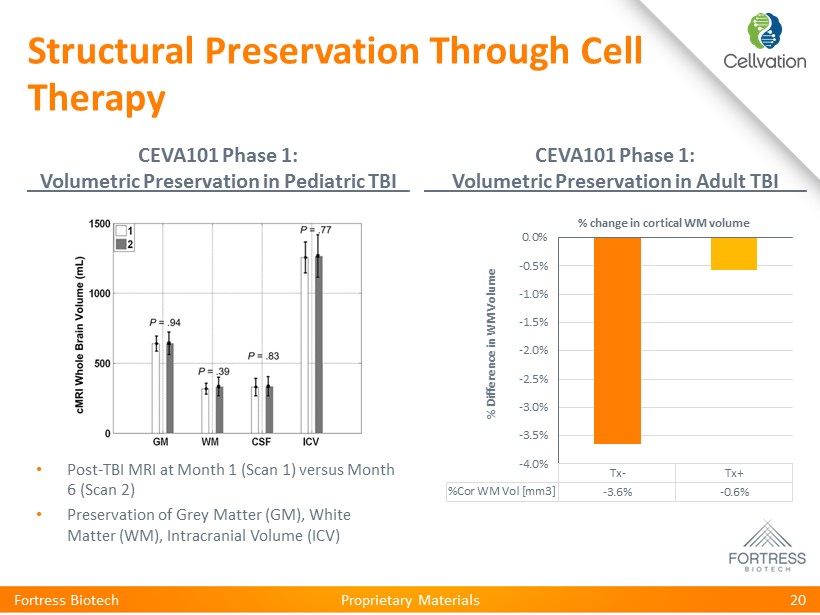 Proprietary Materials Structural Preservation Through Cell Therapy CEVA101 Phase 1: Volumetric Preservation in Pediatric TBI CEVA101 Phase 1: Volumetric Preservation in Adult TBI Fortress Biotech 20 • Post - TBI MRI at Month 1 (Scan 1) versus Month 6 (Scan 2) • Preservation of Grey Matter (GM), White Matter (WM), Intracranial Volume (ICV) Tx- Tx+ %Cor WM Vol [mm3] -3.6% -0.6% -4.0% -3.5% -3.0% -2.5% -2.0% -1.5% -1.0% -0.5% 0.0% % Difference in WM Volume % change in cortical WM volume
