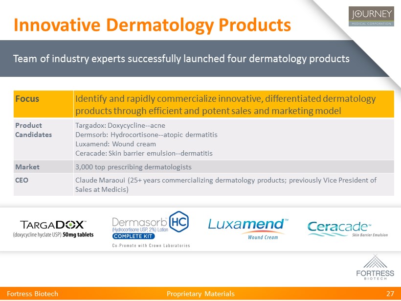 Proprietary Materials Fortress Biotech 27 Focus Identify and rapidly commercialize innovative, differentiated dermatology products through efficient and potent sales and marketing model Product Candidates Targadox : Doxycycline -- acne Dermsorb : Hydrocortisone -- atopic dermatitis Luxamend : Wound cream Ceracade : Skin barrier emulsion -- dermatitis Market 3,000 top prescribing dermatologists CEO Claude Maraoui (25+ years commercializing dermatology products; previously Vice President of Sales at Medicis ) Team of industry experts successfully launched four dermatology products Innovative Dermatology Products