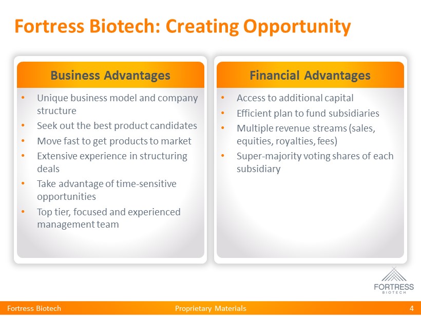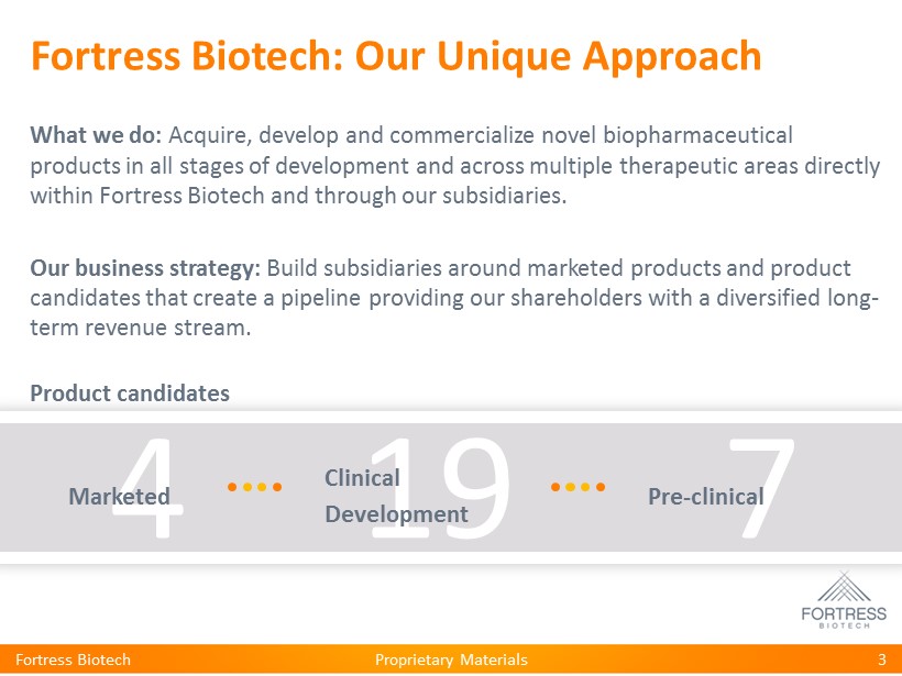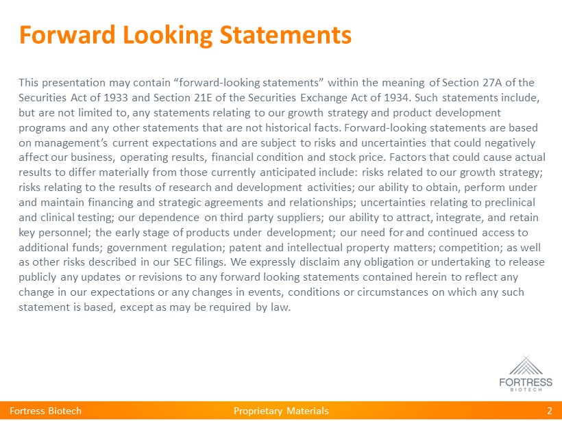 Proprietary Materials Forward Looking Statements This presentation may contain “forward - looking statements” within the meaning of Section 27A of the Securities Act of 1933 and Section 21E of the Securities Exchange Act of 1934. Such statements include, but are not limited to, any statements relating to our growth strategy and product development programs and any other statements that are not historical facts. Forward - looking statements are based on management’s current expectations and are subject to risks and uncertainties that could negatively affect our business, operating results, financial condition and stock price. Factors that could cause actual results to differ materially from those currently anticipated include: risks related to our growth strategy; risks relating to the results of research and development activities; our ability to obtain, perform under and maintain financing and strategic agreements and relationships; uncertainties relating to preclinical and clinical testing; our dependence on third party suppliers; our ability to attract, integrate, and retain key personnel; the early stage of products under development; our need for and continued access to additional funds; government regulation; patent and intellectual property matters; competition; as well as other risks described in our SEC filings. We expressly disclaim any obligation or undertaking to release publicly any updates or revisions to any forward looking statements contained herein to reflect any change in our expectations or any changes in events, conditions or circumstances on which any such statement is based, except as may be required by law. Fortress Biotech 2