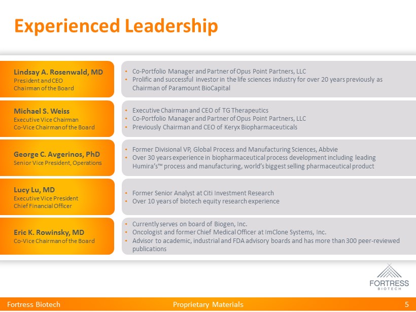 Proprietary Materials Fortress Biotech: Creating Opportunity Business Advantages • Unique business model and company structure • Seek out the best product candidates • Move fast to get products to market • Extensive experience in structuring deals • Take advantage of time - sensitive opportunities • Top tier, focused and experienced management team Financial Advantages • Access to additional capital • Efficient plan to fund subsidiaries • Multiple revenue streams (sales, equities, royalties, fees) • Super - majority voting shares of each subsidiary 4 Fortress Biotech