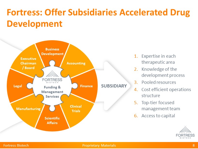Proprietary Materials Provide Efficient Way To Develop / Commercialize A Product Fortress Biotech 7 Identify Product Candidates We seek and identify new in - licensing opportunities in all therapeutic areas and all stages of development from: • Academic centers • Corporate entities • Government health organizations Due - Diligence Perform extensive due diligence on product candidates using: • KOLs • Clinical data • Market size • Competition In - License 1. May create a subsidiary around product candidates / therapeutic areas 2. Fund and support research and development programs 3. Offer flexibility in deal structuring Conventional licensing Acquisitions Partnerships Equity arrangements Joint ventures Public / private financings Option agreements