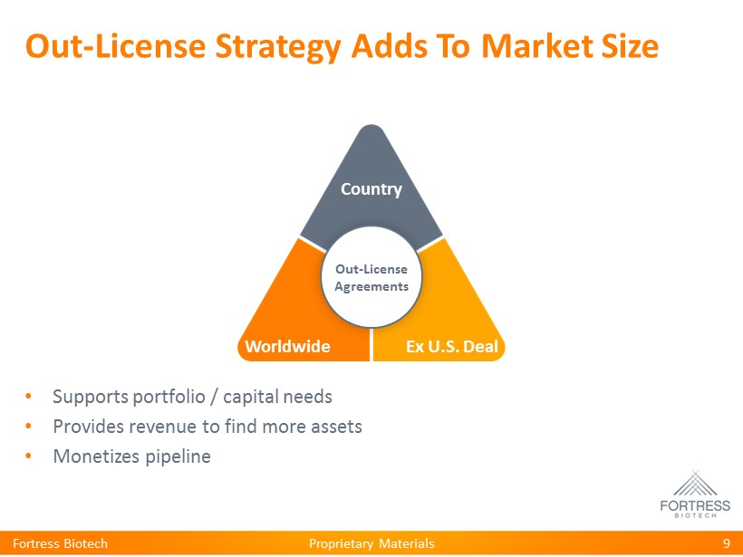 Proprietary Materials Fortress: Offer Subsidiaries Accelerated Drug Development Fortress Biotech 8 Scientific Affairs SUBSIDIARY 1. Expertise in each therapeutic area 2. Knowledge of the development process 3. Pooled resources 4. Cost efficient operations structure 5. Top - tier focused management team 6. Access to capital Funding & Management Services Business Development Finance Scientific Affairs Legal Accounting Clinical Trials Manufacturing Executive Chairman / Board