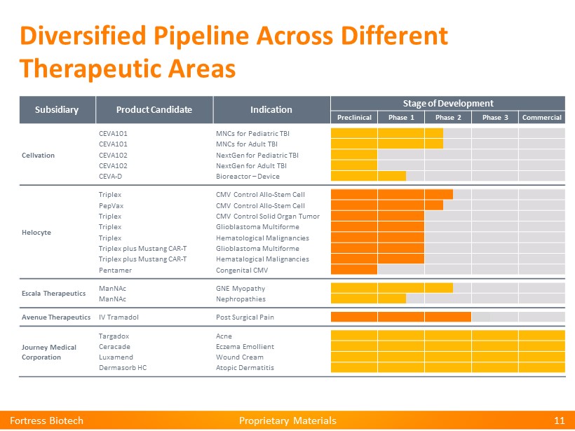 Proprietary Materials Hematology / Oncology Pipeline Subsidiary Product Candidate Indication Stage of Development Preclinical Phase 1 Phase 2 Phase 3 Commercial Caelum Biosciences CAEL - 101 AL Amyloidosis Checkpoint Therapeutics Anti - PD - L1 Solid Tumor Anti - GITR Anti - CAIX CK - 101 EGFR Inhibitor CK - 102 PARP Inhibitor CK - 103 BET Inhibitor Mustang Bio MB - 101 IL13R α 2 - specific CAR Malignant Glioma MB - 102 CD123 CAR AML; BPDCN Fortress Biotech CNDO - 109 AML; MDS 10 Fortress Biotech