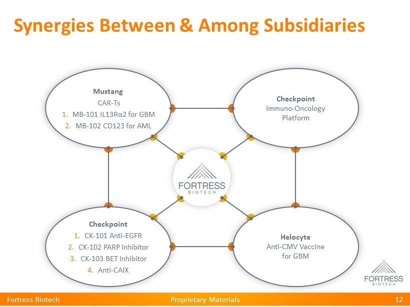 Proprietary Materials Proprietary Materials Diversified Pipeline Across Different Therapeutic Areas Fortress Biotech 11 Subsidiary Product Candidate Indication Stage of Development Preclinical Phase 1 Phase 2 Phase 3 Commercial Cellvation CEVA101 MNCs for Pediatric TBI CEVA101 MNCs for Adult TBI CEVA102 NextGen for Pediatric TBI CEVA102 NextGen for Adult TBI CEVA - D Bioreactor – Device Helocyte Triplex CMV Control Allo - Stem Cell PepVax CMV Control Allo - Stem Cell Triplex CMV Control Solid Organ Tumor Triplex Glioblastoma Multiforme Triplex Hematological Malignancies Triplex plus Mustang CAR - T Glioblastoma Multiforme Triplex plus Mustang CAR - T Hematalogical Malignancies Pentamer Congenital CMV Escala Therapeutics ManNAc GNE Myopathy ManNAc Nephropathies Avenue Therapeutics IV Tramadol Post Surgical Pain Journey Medical Corporation Targadox Acne Ceracade Eczema Emollient Luxamend Wound Cream Dermasorb HC Atopic Dermatitis