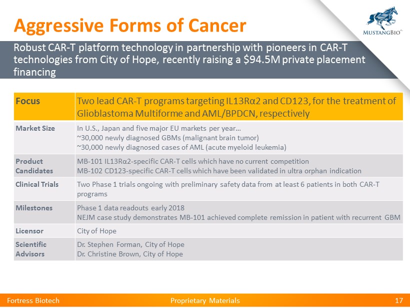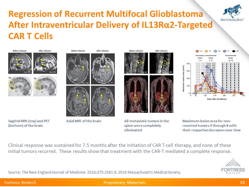Proprietary Materials Proprietary Materials Fortress Biotech 17 Focus Two lead CAR - T programs targeting IL13R α 2 and CD123, for the treatment of Glioblastoma Multiforme and AML/BPDCN, respectively Market Size In U.S., Japan and five major EU markets per year… ~30,000 newly diagnosed GBMs (malignant brain tumor) ~30,000 newly diagnosed cases of AML (acute myeloid leukemia) Product Candidates MB - 101 IL13R α 2 - specific CAR - T cells which have no current competition MB - 102 CD123 - specific CAR - T cells which have been validated in ultra orphan indication Clinical Trials Two Phase 1 trials ongoing with preliminary safety data from at least 6 patients in both CAR - T programs Milestones Phase 1 data readouts early 2018 NEJM case study demonstrates MB - 101 achieved complete remission in patient with recurrent GBM Licensor City of Hope Scientific Advisors Dr. Stephen Forman, City of Hope Dr. Christine Brown, City of Hope Robust CAR - T platform technology in partnership with pioneers in CAR - T technologies from City of Hope, recently raising a $94.5M private placement financing Aggressive Forms of Cancer
