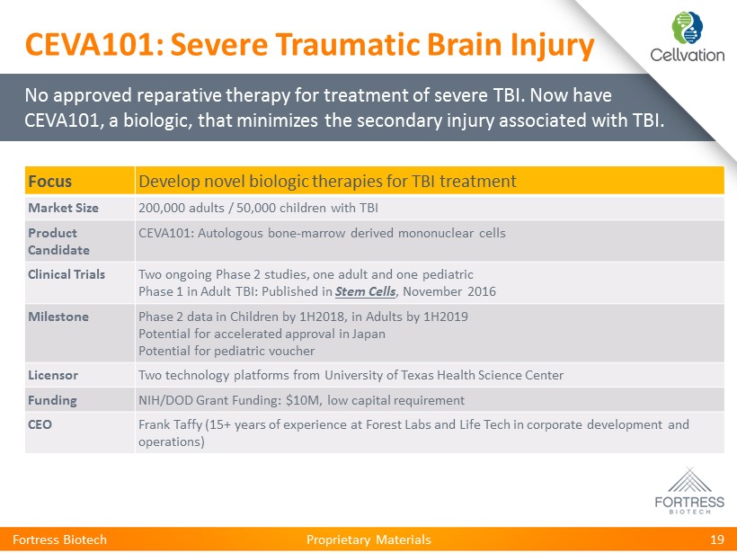 Proprietary Materials Fortress Biotech 19 Focus Develop novel biologic therapies for TBI treatment Market Size 200,000 adults / 50,000 children with TBI Product Candidate CEVA101: Autologous bone - marrow derived mononuclear cells Clinical Trials Two ongoing Phase 2 studies, one adult and one pediatric Phase 1 in Adult TBI: Published in Stem Cells , November 2016 Milestone Phase 2 data in Children by 1H2018, in Adults by 1H2019 Potential for accelerated approval in Japan Potential for pediatric voucher Licensor Two technology platforms from University of Texas Health Science Center Funding NIH/DOD Grant Funding: $10M, low capital requirement CEO Frank Taffy ( 15+ years of experience at Forest Labs and Life Tech in corporate development and operations) No approved reparative therapy for treatment of severe TBI. Now have CEVA101, a biologic, that minimizes the secondary injury associated with TBI. CEVA101: Severe Traumatic Brain Injury