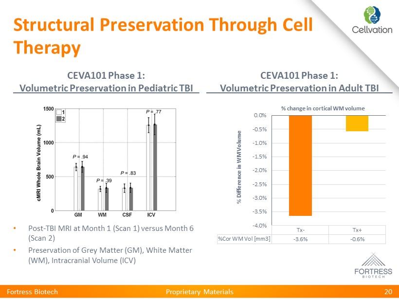 Proprietary Materials Structural Preservation Through Cell Therapy CEVA101 Phase 1: Volumetric Preservation in Pediatric TBI CEVA101 Phase 1: Volumetric Preservation in Adult TBI Fortress Biotech 20 • Post - TBI MRI at Month 1 (Scan 1) versus Month 6 (Scan 2) • Preservation of Grey Matter (GM), White Matter (WM), Intracranial Volume (ICV) Tx- Tx+ %Cor WM Vol [mm3] -3.6% -0.6% -4.0% -3.5% -3.0% -2.5% -2.0% -1.5% -1.0% -0.5% 0.0% % Difference in WM Volume % change in cortical WM volume