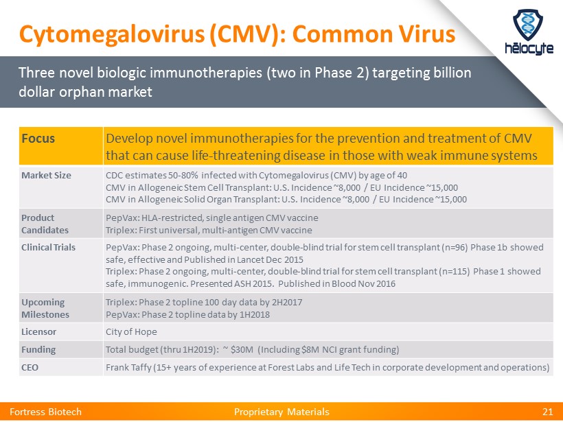 Proprietary Materials Phase 1 Studies: Journal Publications Phase 1b (Completed, Published in The Lancet ) Design Single - Center (City of Hope) Study in 36 Allogeneic HSCT CMV(+)Recipients Randomized (1:1) between Vaccine Arm (VA) and Observation Arm (OA) Dosing Schedule Two subcutaneous vaccinations after transplant • Day 28 • Day 56 1˚ Endpoint Overall safe and well - tolerated Published in The Lancet Haematology (12/28/2015) 2˚ Endpoint • Increase in CD8+ T - cells • Reduced CMV Reactivation, 6% vs.33%,p=0.044 • Reduced Relapse, 6% vs. 28%, p=0.015 • Reduced Death, 0vs. 39% Phase 1 (Completed, Published in Blood ) Fortress Biotech 22 Vaccine (n=18 ) Observation (n=18) Patients with serious adverse events 4 (22%) 9 (50%) Disease relapse 1 (6%) 5 (28%) Death 0 (0%) 7 (39%) CMV viraemia (≥500 gc/mL ) 1 (6%) 6 (33%) Design Single - Center (City of Hope) Dose Escalation (three levels) in 24 Healthy Volunteers (CMV +/ - ) Dosing Schedule Two IM injections four weeks apart Last patient dosed 4/2015 1˚ Endpoint Safe and well - tolerated in all dose cohorts Presented at ASH (December 2015) Published in Blood (November2016) 2˚ Endpoint ↑pp65 - , IE1 - , IE2 - specific CD8 and CD4 T - cells Particularly pronounced increase in T - cells in those with low baseline levels
