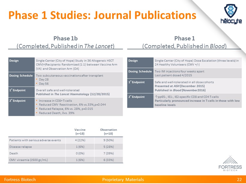 Proprietary Materials Proprietary Materials Fortress Biotech 21 Focus Develop novel immunotherapies for the prevention and treatment of CMV that can cause life - threatening disease in those with weak immune systems Market Size CDC estimates 50 - 80% infected with Cytomegalovirus (CMV) by age of 40 CMV in Allogeneic Stem Cell Transplant: U.S. Incidence ~8,000 / EU Incidence ~15,000 CMV in Allogeneic Solid Organ Transplant: U.S. Incidence ~8,000 / EU Incidence ~15,000 Product Candidates PepVax : HLA - restricted, single antigen CMV vaccine Triplex: First universal, multi - antigen CMV vaccine Clinical Trials PepVax : Phase 2 ongoing, multi - center, double - blind trial for stem cell transplant (n=96) Phase 1b showed safe, effective and Published in Lancet Dec 2015 Triplex: Phase 2 ongoing, multi - center, double - blind trial for stem cell transplant (n=115) Phase 1 showed safe, immunogenic. Presented ASH 2015. Published in Blood Nov 2016 Upcoming Milestones Triplex: Phase 2 topline 100 day data by 2H2017 PepVax : Phase 2 topline data by 1H2018 Licensor City of Hope Funding Total budget (thru 1H2019): ~ $30M (Including $8M NCI grant funding) CEO Frank Taffy (15+ years of experience at Forest Labs and Life Tech in corporate development and operations) Three novel biologic immunotherapies (two in Phase 2) targeting billion dollar orphan market Cytomegalovirus (CMV): Common Virus