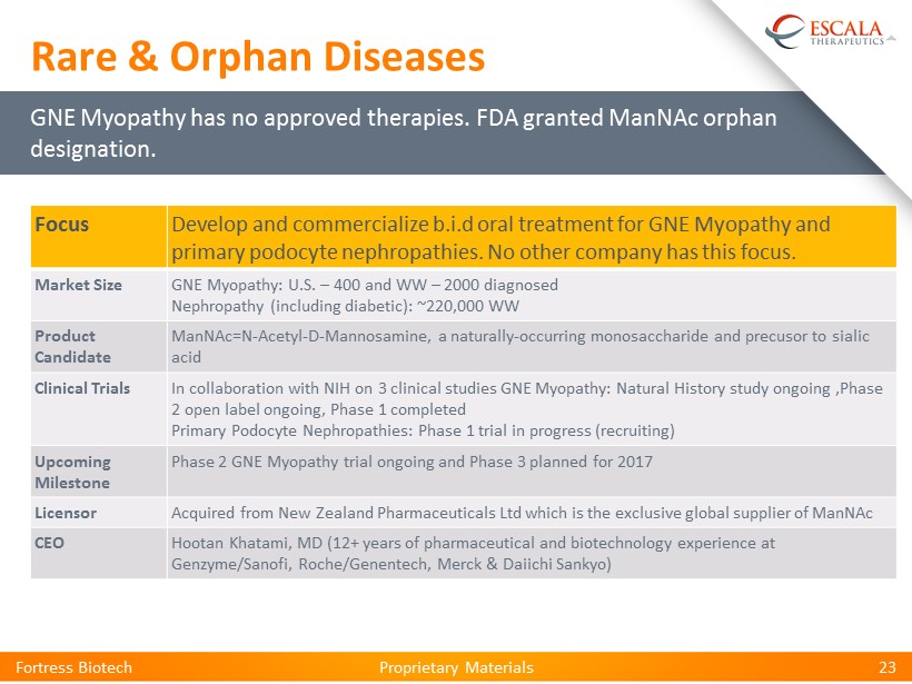 Proprietary Materials Proprietary Materials Fortress Biotech 23 Focus Develop and commercialize b.i.d oral treatment for GNE Myopathy and primary podocyte nephropathies. No other company has this focus. Market Size GNE Myopathy : U.S. – 400 and WW – 2000 diagnosed Nephropathy (including diabetic): ~220,000 WW Product Candidate ManNAc =N - Acetyl - D - Mannosamine , a naturally - occurring monosaccharide and precusor to sialic acid Clinical Trials In collaboration with NIH on 3 clinical studies GNE Myopathy : Natural History study ongoing ,Phase 2 open label ongoing, Phase 1 completed Primary Podocyte Nephropathies: Phase 1 trial in progress (recruiting) Upcoming Milestone Phase 2 GNE Myopathy trial ongoing and Phase 3 planned for 2017 Licensor Acquired from New Zealand Pharmaceuticals Ltd which is the exclusive global supplier of ManNAc CEO Hootan Khatami, MD (12+ years of pharmaceutical and biotechnology experience at Genzyme/Sanofi, Roche/Genentech, Merck & Daiichi Sankyo) GNE Myopathy has no approved therapies. FDA granted ManNAc orphan designation. Rare & Orphan Diseases